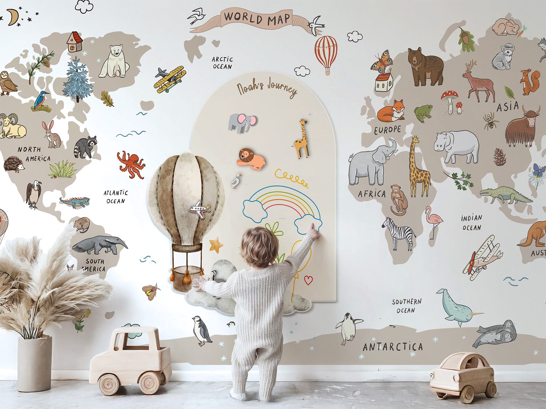 The World Map Collection by The Tiny Koala transforms ordinary walls into a watercolor atlas — where friendly animals roam across continents. Designed in Belgium, this collection blends art and learning to create a calm, story-inspired space that grows with your little explorer.