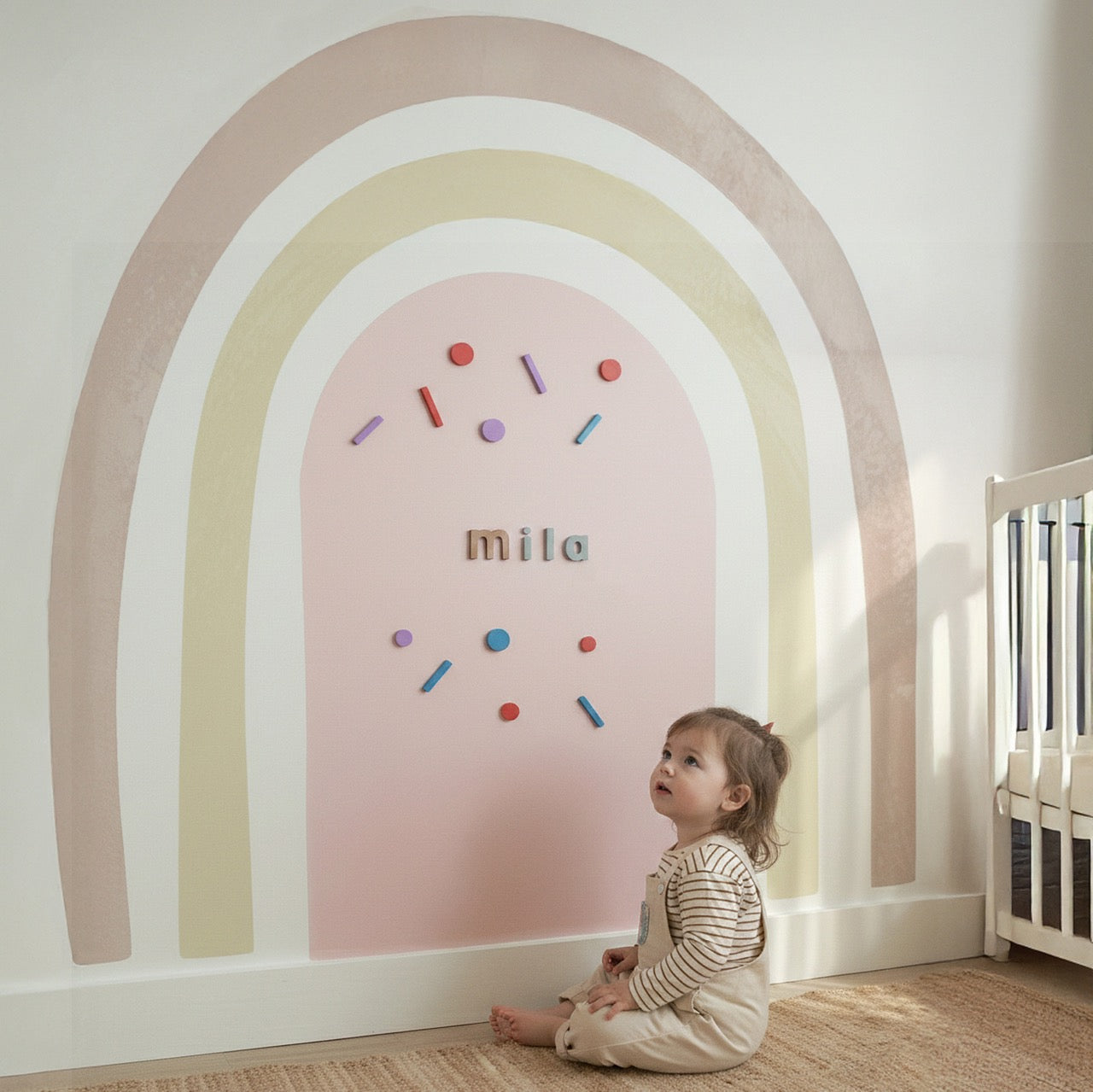 Close-up of a toddler placing wooden name magnets on a blue magnetic arch wall in a children’s room