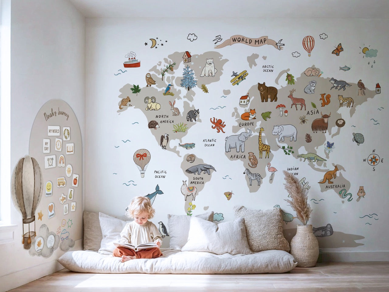 This set made our toddler room feel like a dreamy little world. The map wallpaper is beautiful and educational, and the hot air balloon decal adds a fun, imaginative touch.
