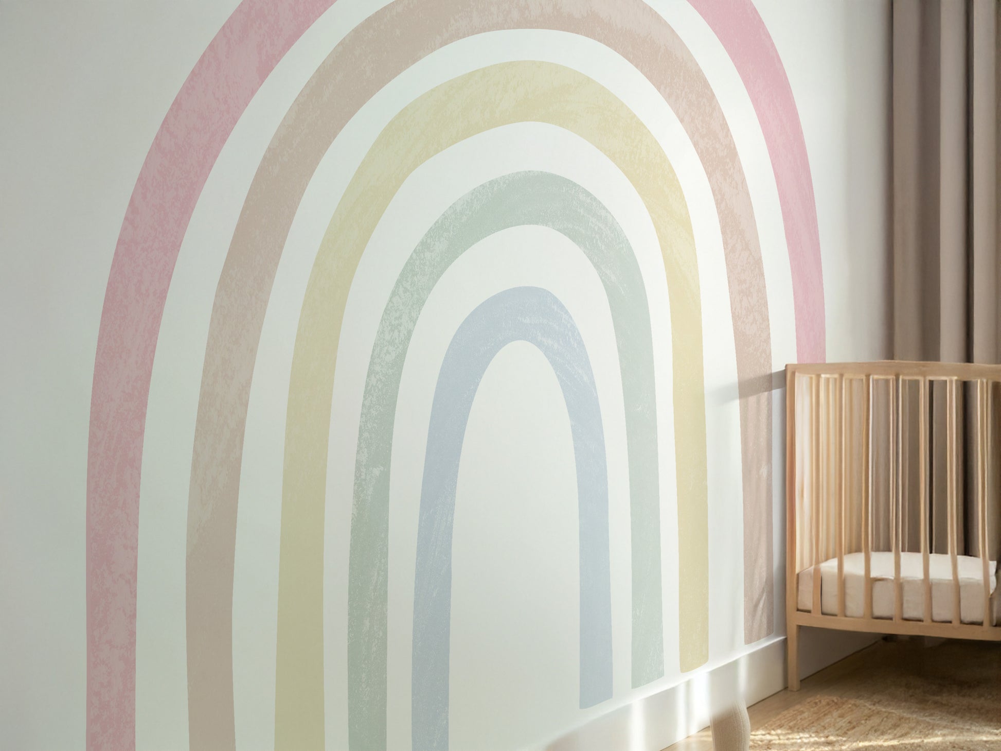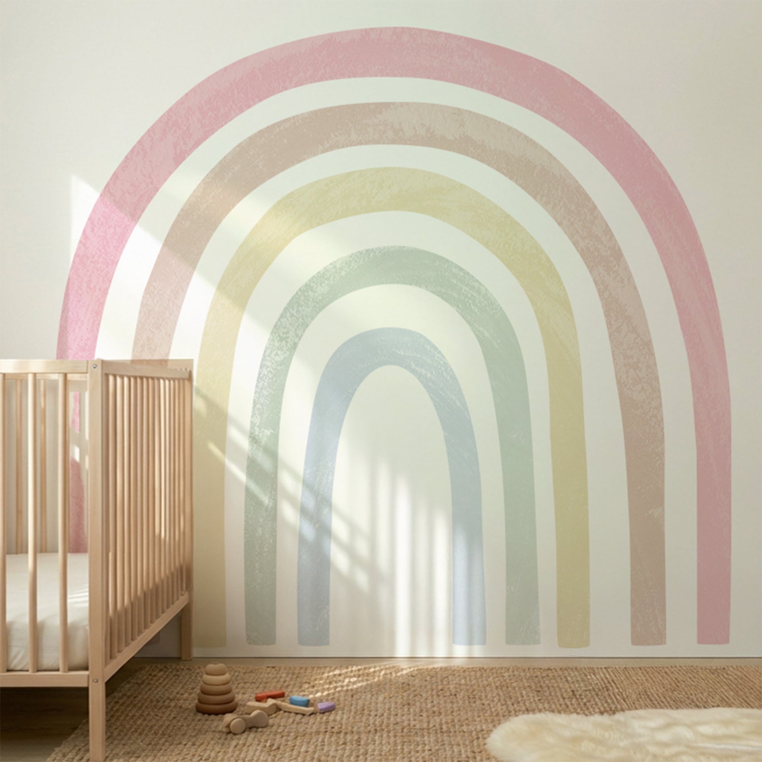 The large rainbow shape creates balance and visual warmth, making it ideal above beds, cribs, or reading corners. Its hand-painted look blends beautifully with Scandinavian and modern nursery styles.
